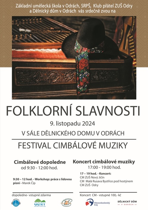Máte rádi cimbálovou muziku? Tak na setkání s vámi se těšíme na Folklorních slavnostech, které se uskuteční v sobotu 9. listopadu 2024 v sále Dělnického domu v Odrách.