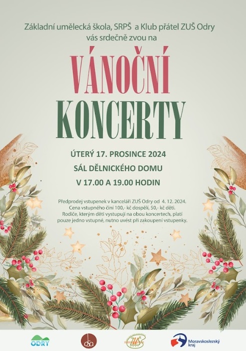 Vážení rodiče a příznivci naší školy, jsme velice rádi, že vás můžeme pozvat na Vánoční koncerty, které se uskuteční v úterý 17. prosince 2024 v sále dělnického domu v Odrách v 17 a 19 hodin.